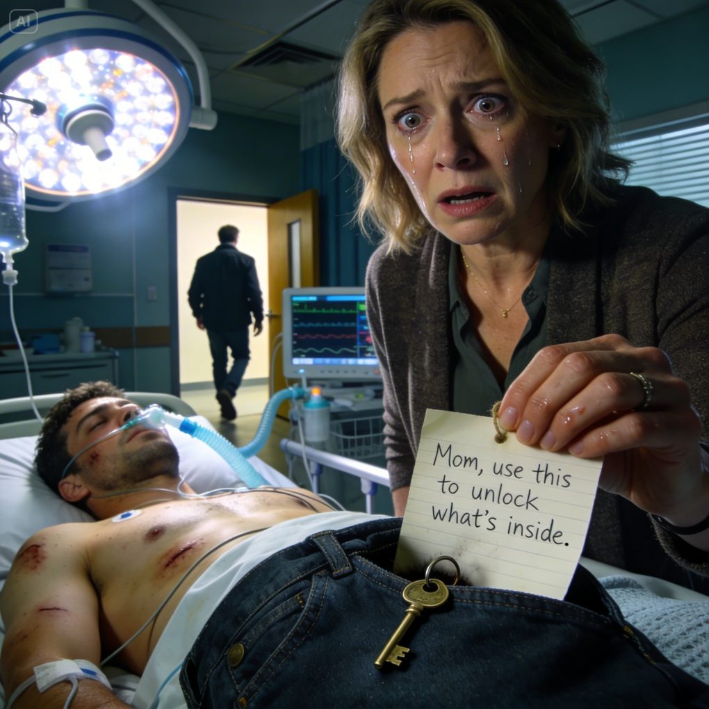I walked into my son’s hospital room after the accident had left him in a coma. The doctor said, “The chances of him waking up are very low.” My husband walked away without saying a word, leaving me alone beside my son’s bed. When I reached out to hold his hand, a small key slipped out of his pocket. Attached to it was a note written in shaky handwriting: “Mom, use this to open what’s inside.”